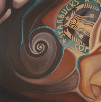 Starbucks is een goed voorbeeld van een grote winkelketen in Canada (ook in de V.S. en veel grote steden in Europa al te vinden). In Vancouver waren er op afstand van 5 minuten van mijn huis al drie te vinden. Starbucks is eigenlijk te vergelijken met de Mac Donalds, maar dan een zaak waar je verschillende soorten koffie kan kopen. Opvallend vond ik dat in elke stad waar ik kwam dezelfde winkels te vinden waren, met dezelfde kleren. Er waren eigenlijk geen eenmansbedrijfjes, kleine barretjes of markten zoals we in Nederland gewend zijn. Het St arbuckslogo vermengd zich met de koffie, in zekere zin als vergif, wat de drinker ervan binnenkrijgt. |