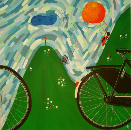 De tegenstelling tussen mensen die fietsen en mensen die altijd de auto pakken, is in Vancouver erg groot. Ik had als student geen auto tot mijn beschikking, maar had een mountainbike. Tot mijn grote frustratie miste er een hoop aan deze fiets, zoals spatbord, licht en ga zo maar door… Vandaar mijn ode aan de Oerhollandse fiets, met daarbij de ironische situatie van fietser - regen en automobilist - zonneschijn. |