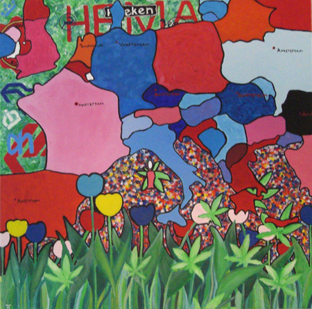 Als reactie op de eerste vijf schilderijen uit deze serie, heb ik als afsluiter er een gemaakt over Europa. Zodra ik in Vancouver vertelde dat ik Hollands was, kwamen er alleen verhalen over wiet, tulpen en Amsterdam naar boven.Toch wisten de meeste Canadezen niet eens waar Amsterdam in Europa te vinden is…. Daarnaast heb ik als reactie op alle commerciële onderwerpen van de vorige schilderijen een aantal grote commerciële bedrijven uit Nederland in het schilderij geplaatst. Verkocht |